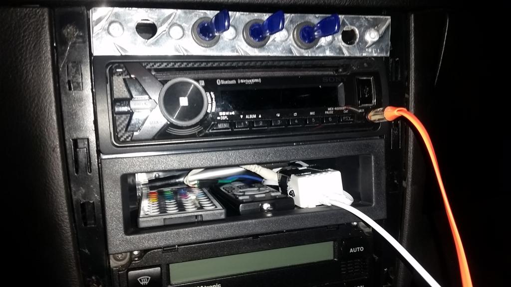 the setup. switches above and the white box on the right side is the control. remote in middle for radio, remote on left for changing colors
